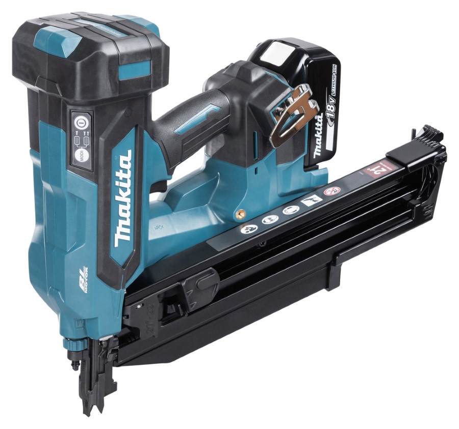 Bezsuku motoram aprīkots konstrukciju naglotājs, kas spēj iedzīt līdz 90 mm garas karkasa naglas līmētā koksnē un citos materiālos, nodrošinot līdzīgu trieciena sajūtu kā pneimatiskajam naglotājam. 18V LXT® konstrukciju naglotājs ir drošāks un ērtāks nekā tradicionālie vadu vai pneimatiskie naglotāji. Akumulatora darbināmais naglotājs neprasa šļūteni vai kompresoru, tādējādi samazinot troksni un novēršot paklupšanas risku pie šļūtenes. Inovatīvs gaisa atsperes mehānisms un izturīgs bezsuku motors nodrošina ātru un efektīvu naglošanu bez ārēja kompresora vai gāzes balona, piedāvājot lielāku mobilitāti un vienkāršāku lietošanu. DBN901 ir aprīkots ar jaudīgu LED darba apgaismojumu ar priekšējās un aizmugurējās apgaismojuma funkcijām, lai darba zona vienmēr būtu labi apgaismota. Naglošanas dziļumu var viegli regulēt ar grozāmu pogu, nodrošinot katru reizi perfektu apdari. Neslīdoša uzgaļa forma nodrošina naglu taisnu ievietošanu pat sarežģītos leņķos. Naglu atlikumu daudzumu var ērti uzraudzīt integrētā logā. Tukšas žurnāla apturēšanas funkcija aptur instrumentu, kad žurnālā nav vairāk naglu. Naglotājam komplektā ir divi dažādi pakarināšanas āķi, kurus var pielāgot dažādiem darba veidiem. Sijas āķa platums ir līdz 2-1/2″, un tas ir ideāli piemērots instrumenta stiprināšanai uz kāpnēm un skrejceltnēm.