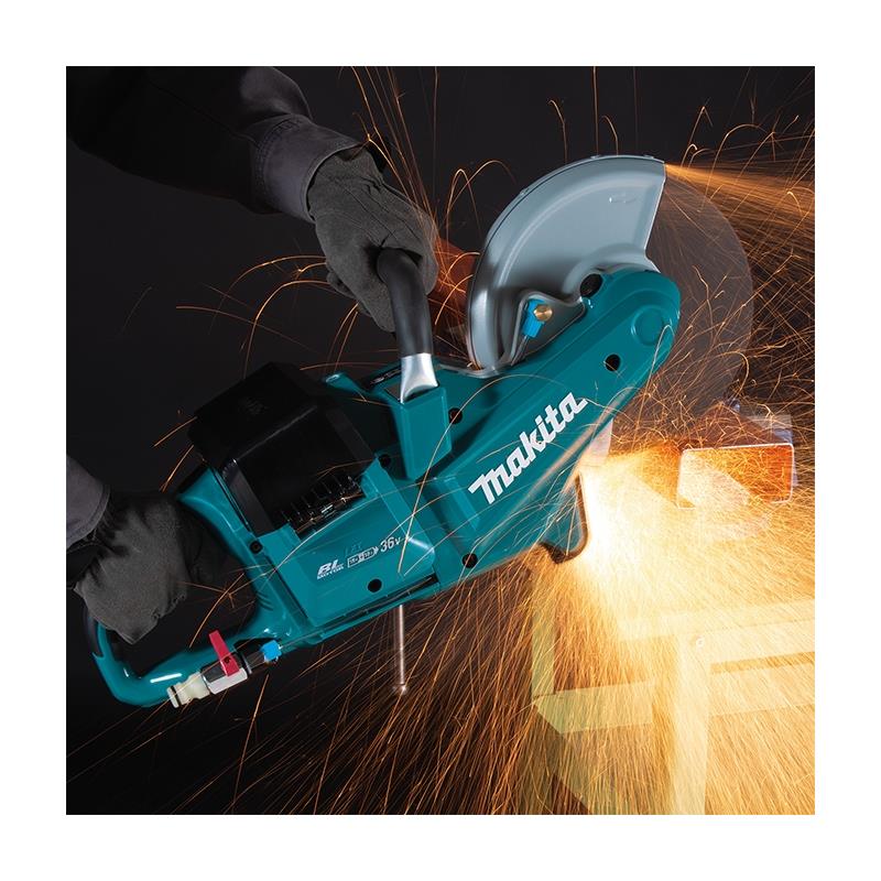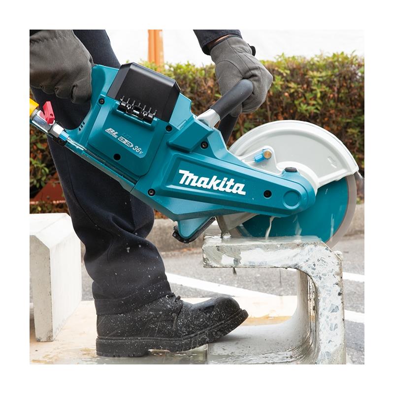 Piemērota gan sausai, gan mitrai griešanai. Var izmantot arī ar abrazīvajiem griešanas diskiem. Maks. griešanas dziļums: 88 mm. Piemēroti griešanas diski 230 mm (piemēroti leņķa slīpmašīnas diski). Jaudīgs bezsuku motors un 6600 apgriezieni minūtē padara griešanu vienkāršu un ātru. Elektriskais diska bremzētājs – funkcija, kas nav pieejama lielajām benzīna dzinēja leņķa slīpmašīnām, kas palielina darba drošību un arī darba ātrumu (aptur abrazīvo griešanas disku 2 sekundēs / dimanta pārklājuma disku 4 sekundēs). LED darba apgaismojums, kas ļauj griezt materiālus arī tumšās vai slikti apgaismotās vietās, kur nav elektrības. LED apgaismojumu var ieslēgt/izslēgt, izmantojot roktura slēdzi. Akumulatoru aizsargvāks palīdz uzturēt akumulatorus sausā un putekļainā darba vidē. Pārslodzes brīdinājuma sarkanais LED indikators – sekojot sarkanajam brīdinājuma signālam darba laikā, ir iespējams samazināt instrumentam pielietoto spēku, uzlabot griešanas rezultātu un pagarināt instrumenta darba laiku ar vienu uzlādi. Bloķēšanas slēdzis lietotāja drošības palielināšanai. Lēna palaišana. Mitrai griešanai iespējams pieslēgt gan dažādus konteinerus, gan tieši dažādus ūdens tīklus. Visa ūdens padeves sistēma ir kompakti izvietota instrumenta korpusā, lai samazinātu bojājumu iespējas un samazinātu darba traucējošos faktorus.