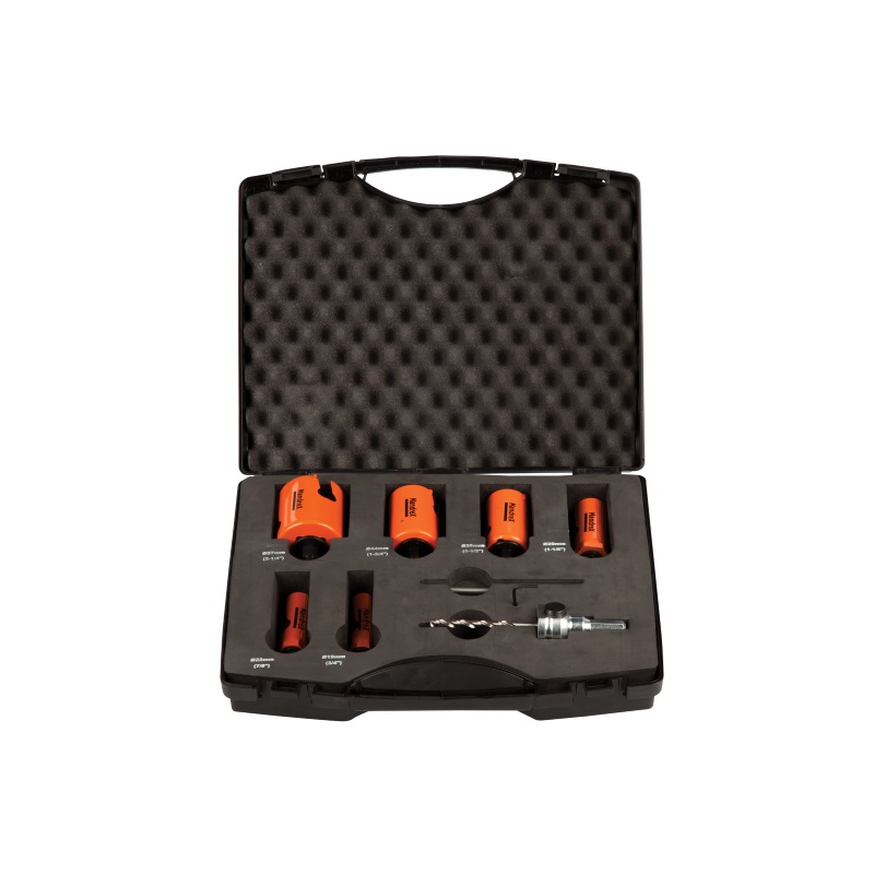 Komplektā ietilpst: 7 caurumu zāģi (izmēri 16 / 20 / 24 / 29 / 37 / 70 / 73 mm), MXqs adapteris ar HSS centrurbi, 1x TCT centrurbis.