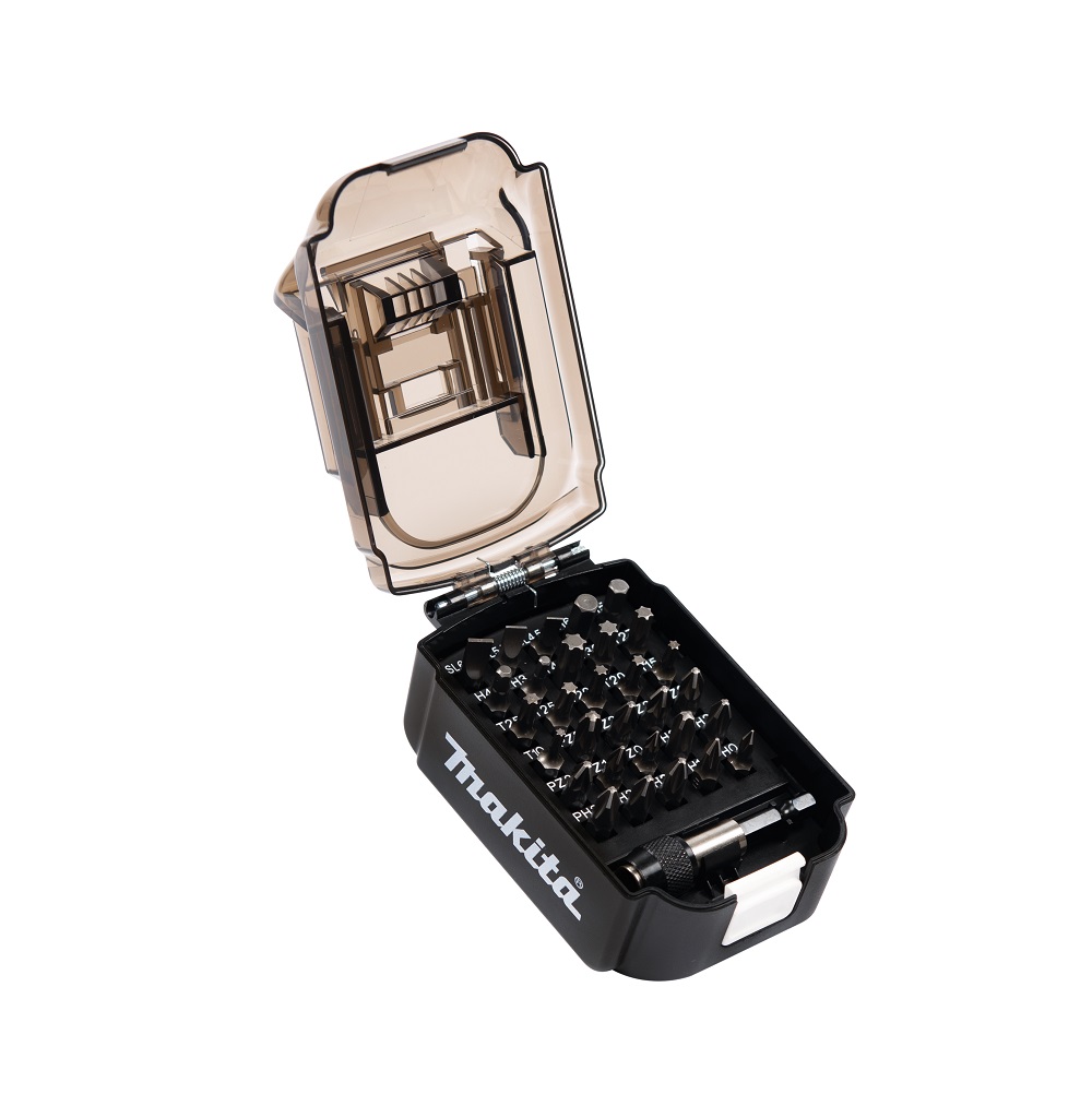 Makita akumulatora kastītē uzgaļu komplekts 31 daļas PH0, PH1, PH2, PH3, PZ0, PZ1, PZ2, PZ3, T10, T15, T20, T25, T27, T30, T40, HEX3, HEX4, HEX5,1HEX6, SL0.6×4.5, SL0.8×5.5, SL1.2×6.5