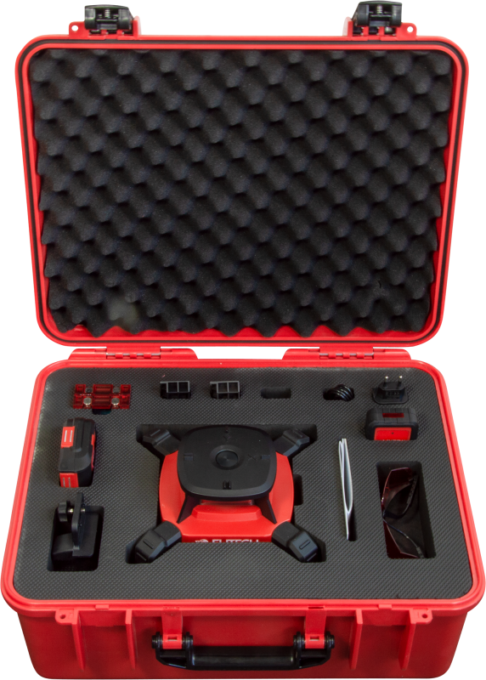 Rotējošais lāzers, PARA uztvērējs, pults, koferis, barošanas adapteris/lādētājs, brilles