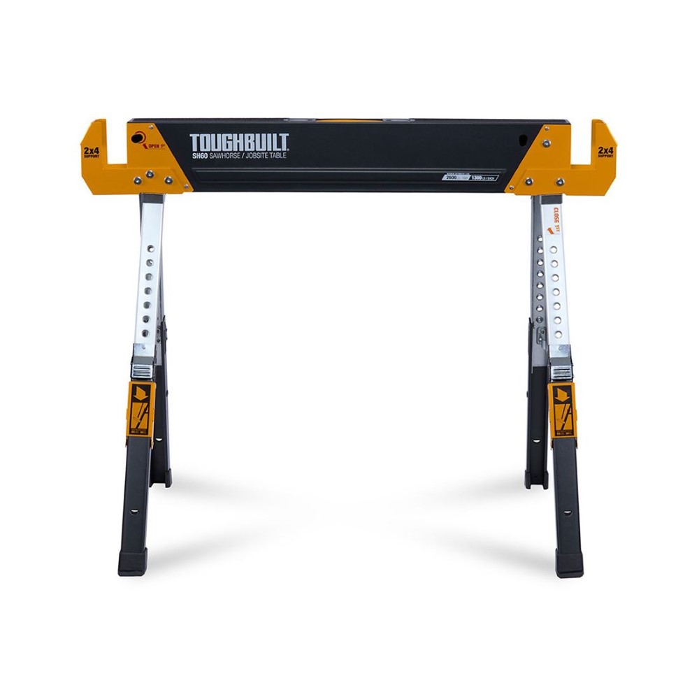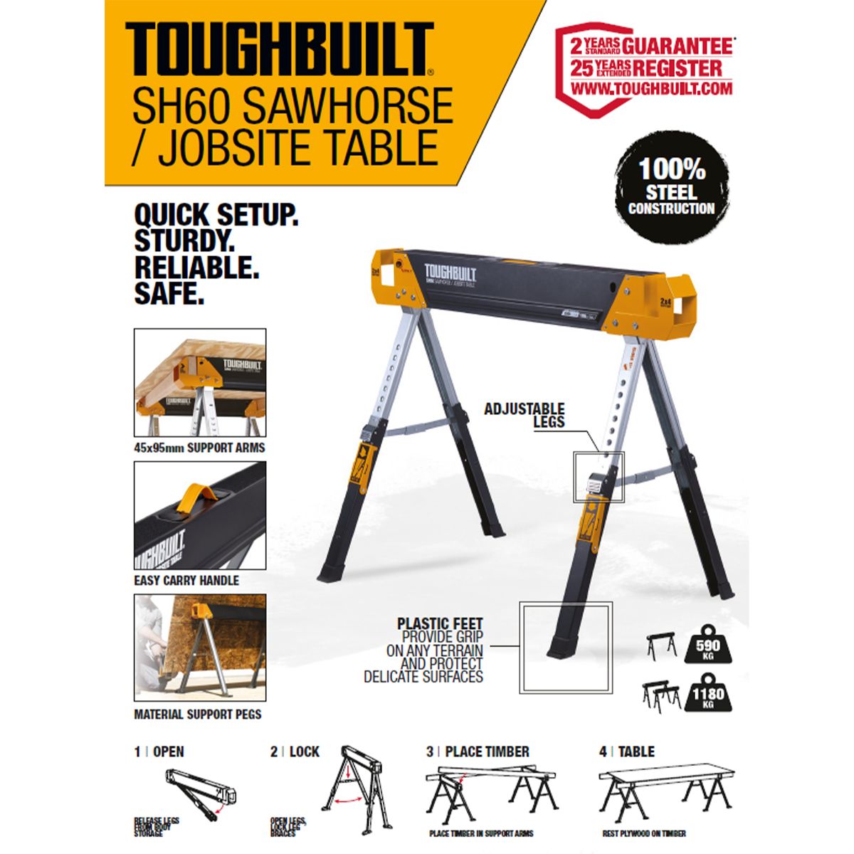 ToughBuilt® SH60 zāģa un darba galds ir izturīgs. Regulējamas kājas. Šis 100% augstas kvalitātes tērauda zāģa statīvs ir ar ievērojamu nestspēju. Nestspēja 590kg vienam un 1180kg pārim. Izmantojot 45x90mm baļķus, no statīviem var izveidot darba galdu. Ietver arī inovatīvus materiālu balstus, kas ļauj materiālus uzglabāt vertikāli un viegli griezt. Tam ir arī viegli salokāmas kājas. Šim salokāmajam zāģa statīvam ir rokturis transportēšanai un rullētas malas drošībai un ērtībai.