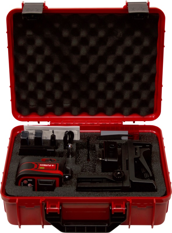 2x Li-Ion akumulators, lādētājs, koferis, marķēšanas plāksne, aizsargbrilles, sienas stiprinājums ar magnētu, rotators, tālvadības pults