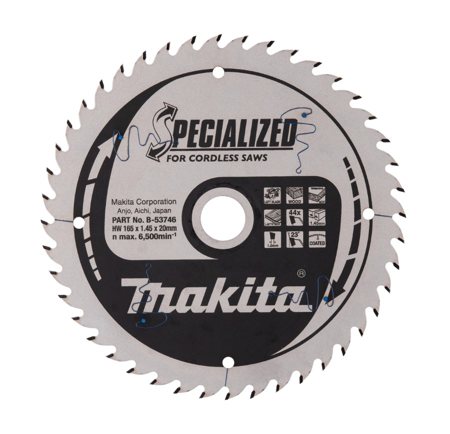 Zāģa disks ar T.C.T zobiem koka/MDF/lamināta griešanai 165X1.45X20mm 23° T44 SPECIALIZED. Volframa karbīda zobu zāģa disks SPECIALIZED. Diska asmens diametrs ir 165 mm un cauruma izmērs 20 mm. Zobu skaits 44 un zāģēšanas solis 1,45 mm. Piemērots melamīna koka griešanai.
