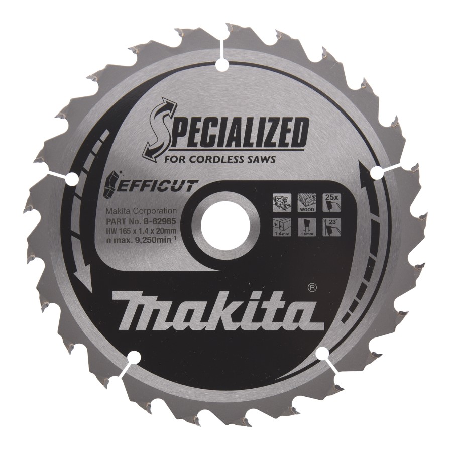 Zāģa disks ar T.C.T zobiem koka griešanai 165X1.4X20mm 23° T25 EFFICUT. Volframa karbīda zobu zāģa disks EFFICUT efektīvai un ātrai koka griešanai. Piemērots akumulatora ripzāģiem un vadu ripzāģiem. Diska asmens diametrs ir 165 mm un cauruma izmērs 20 mm. Zobu skaits 25 un zāģēšanas solis 1,4 mm.
