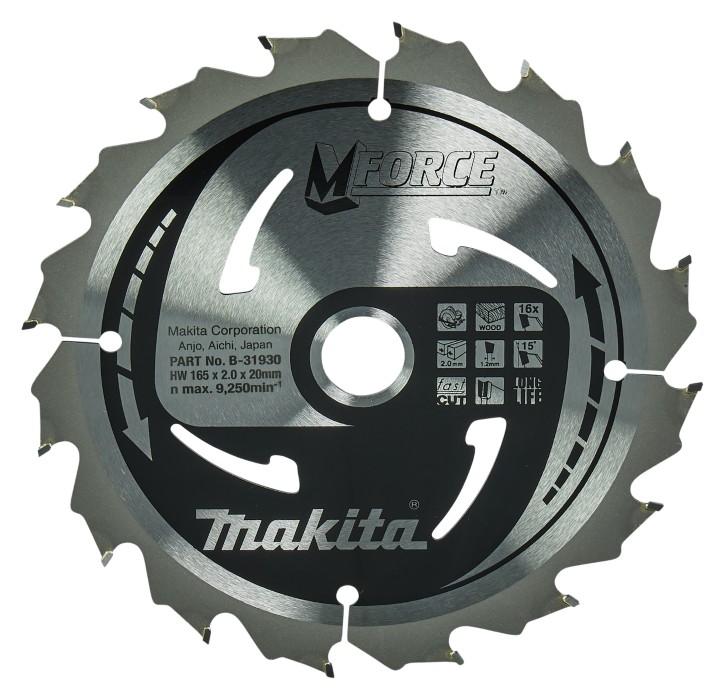 Zāģa disks ar T.C.T zobiem koka griešanai. Volframa karbīda zobu zāģa disks M-FORCE precīzai koka griešanai. Diska asmens diametrs ir 165 mm un cauruma izmērs 20 mm. Zobu skaits 16 un zāģēšanas solis 2,0 mm. Piemērots ripzāģiem.