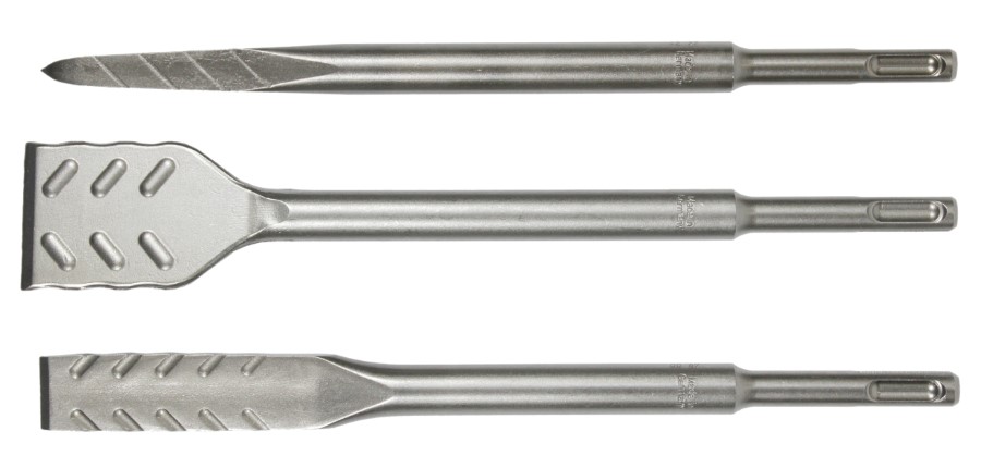 SDS-PLUS dūrējamais un meislu komplekts betona darbiem. Meislu nelīdzenā virsma augšpusē un sānos samazina meisla iesprūšanas iespējamību un nodrošina labāku darba efektivitāti. Plastmasas kastē.